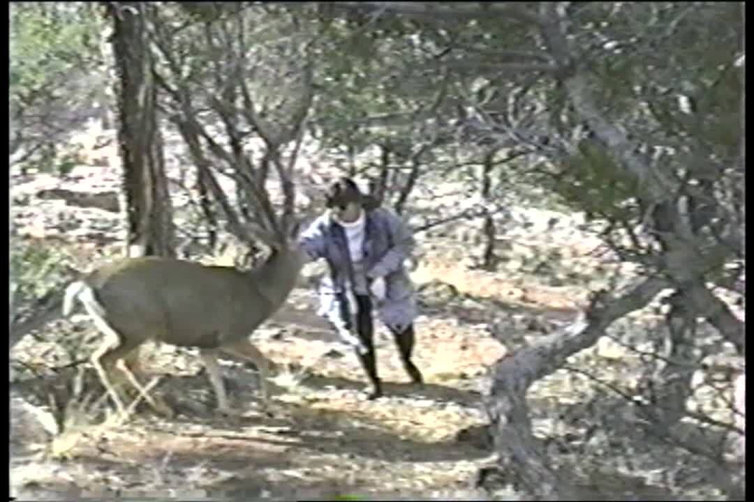 Bonehead woman tries to hug a wild deer after feeding it. Deer kicks woman 5 or 6 times in the back of the head & neck to get her away. Short recovery. Woods.
