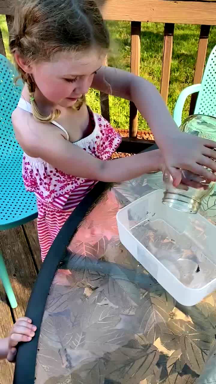 A tot girl pours a jar of cicadas out in the yard, and repeatedly tells her mother to "be calm". Then one of the bugs touches her finger and she screams.