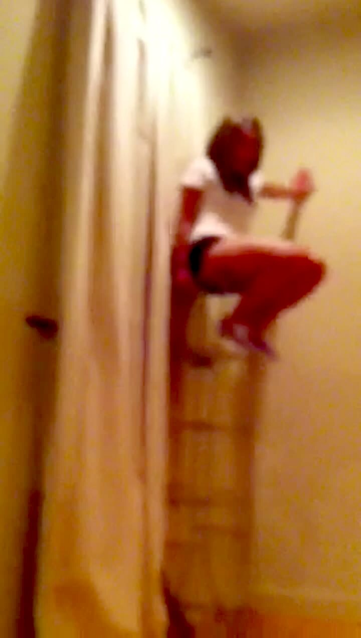 Teen girl sits on top of rack of shelves in bedroom, tries to jump down, shorts get caught on shelf.