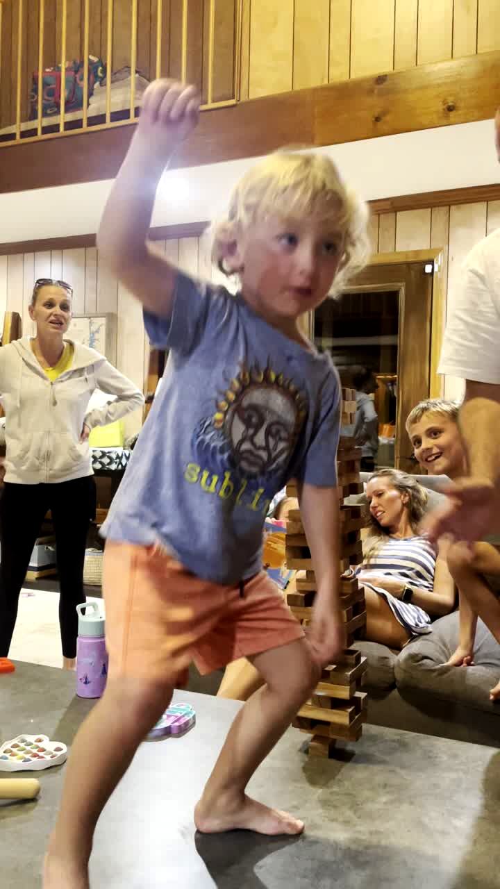 A young boy stands on a table and sets a Jenga piece on the tower. When it doesn't fall he starts to dance in victory. As he dances the stack falls.