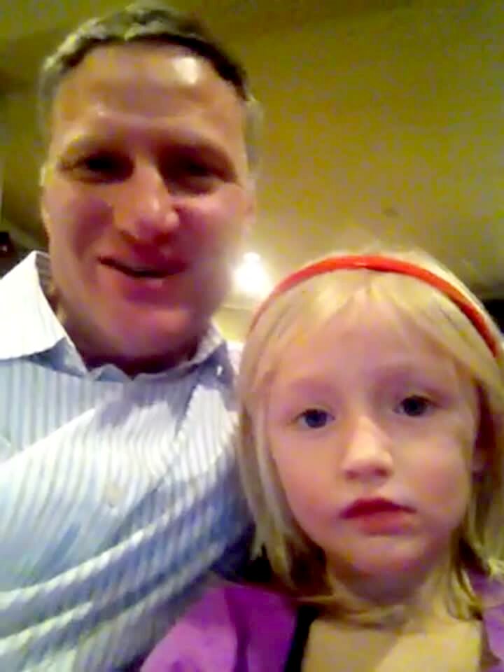 A man teaches a young girl how to film a selfie video on her iPad in the living room, and she says "I really love you." When the man says "I love you too," the young girl says "I was talking to the iPad."