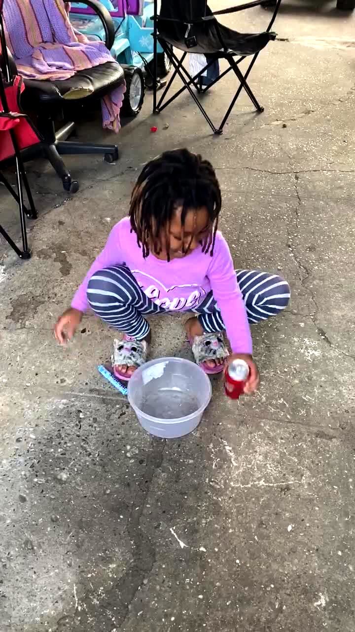 A young girl empties a can of soda into a bucket for a science experiment. At 1:03, her tot brother drives a toy truck on top of the bucket in a garage.