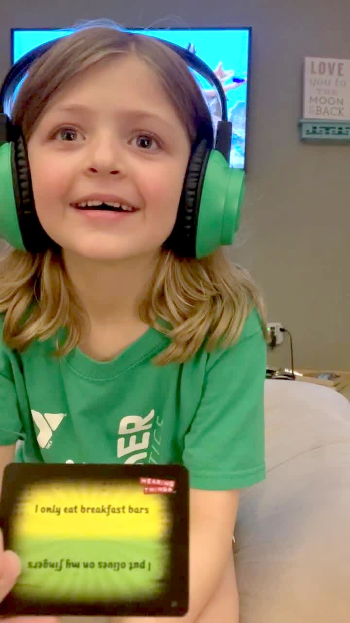 A young girl plays a game with her mother in the house, and tries to guess a phrase while she wears noise-canceling earphones. She repeatedly says "I only see private parts" instead of "I only eat breakfast bars".