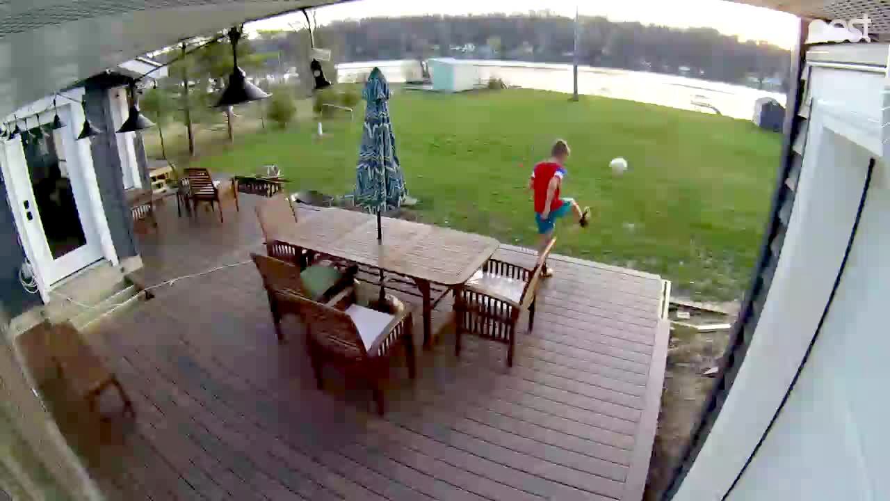 A young boy kicks a ball off of a deck and then tries to step down, but the end of the deck breaks and he falls. Security footage.