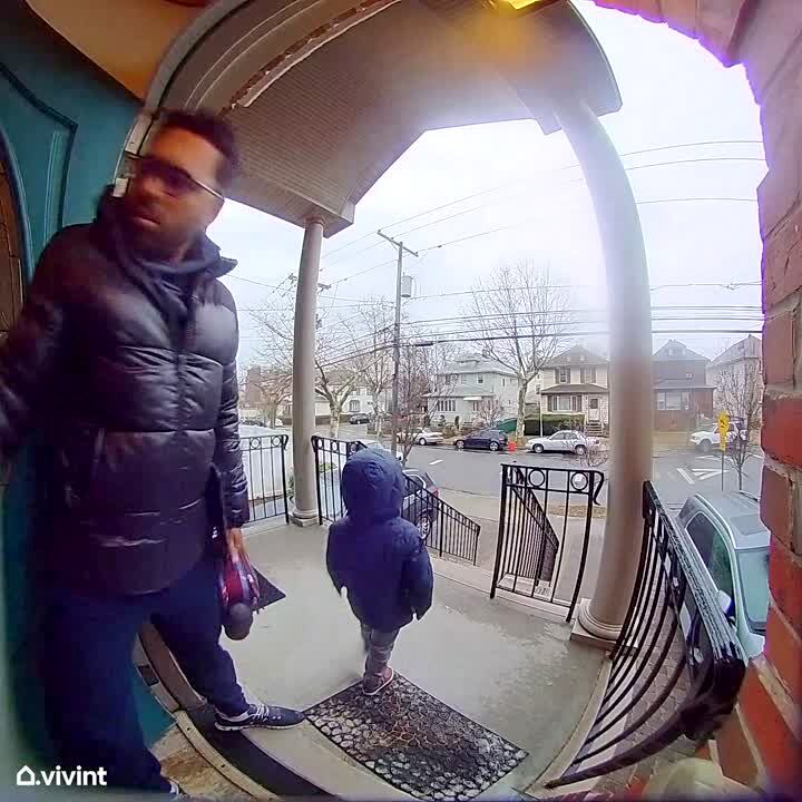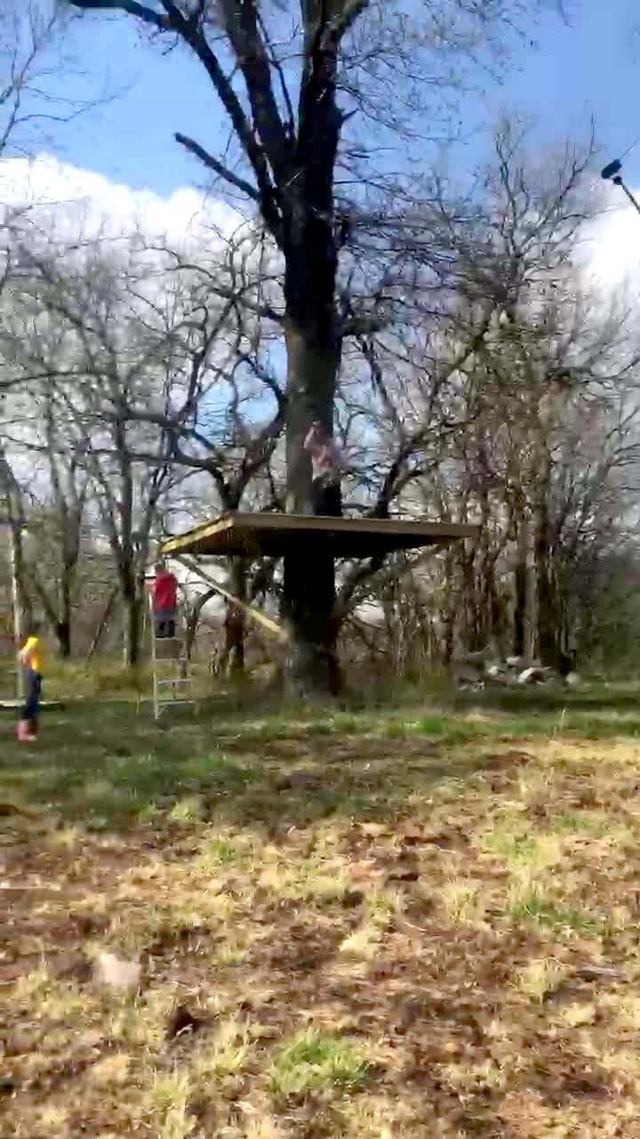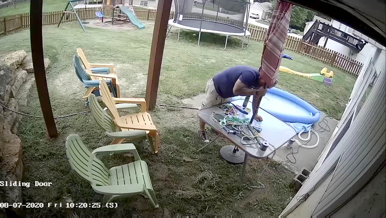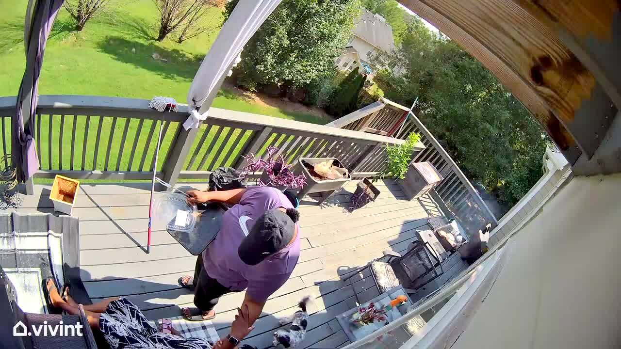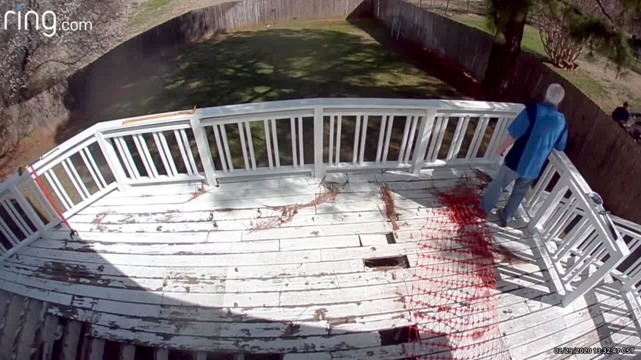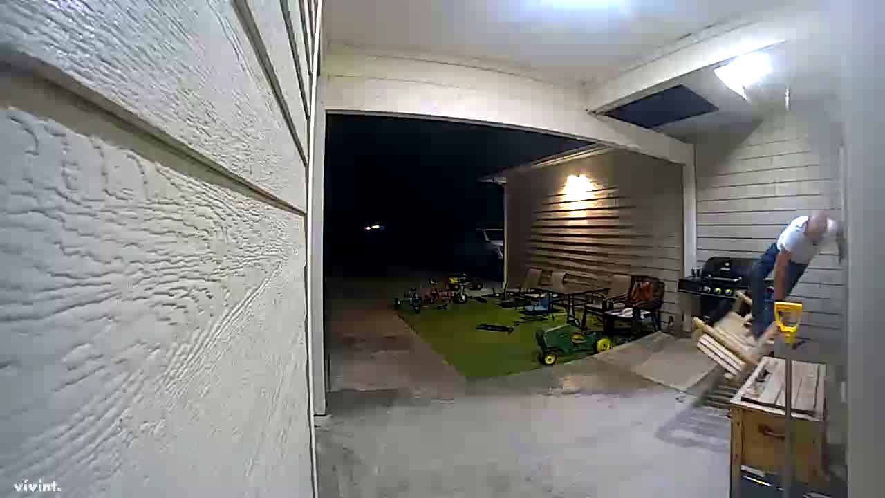 A man stands on a porch swing to look at a bird's nest, then he falls off of the swing. Security footage.