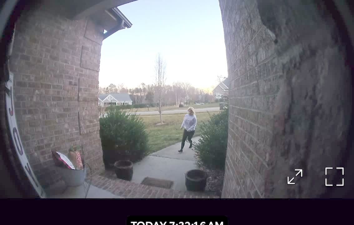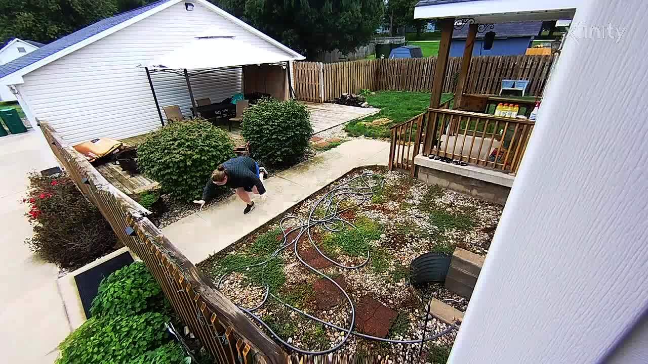 A woman runs towards a porch and falls on her face as she hits the step. Security Camera Footage.