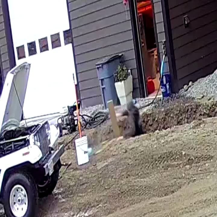A man attempts to walk across a thin board while he works on a yard but it breaks and he drops down into a ditch with feet up. Security footage.