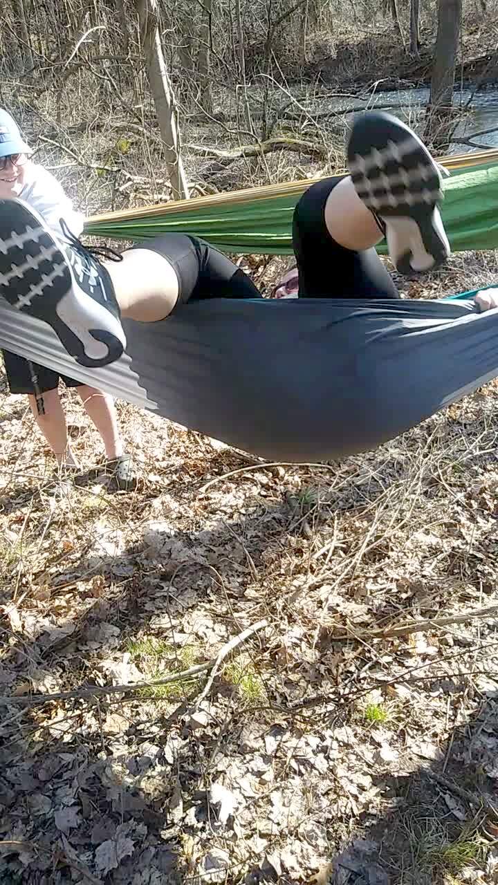 A woman swings in a hammock to try to get out of it, but one of the trees it is tied to collapses.