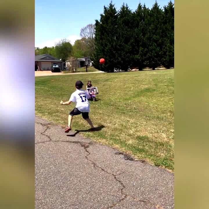 A young boy attempts to shoot a basketball into the basket of his sister's child sized motor scooter as she rides past. He misses and she falls down into the grass.