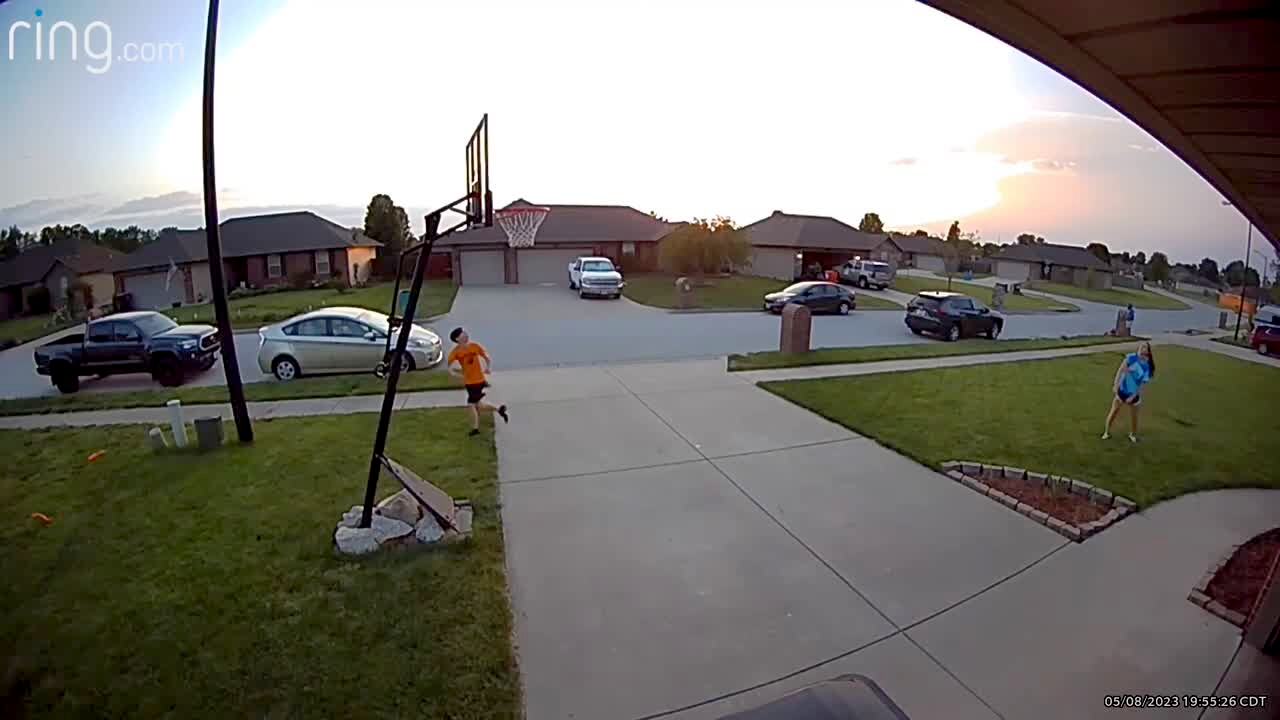 Teen boy dunks on basketball goal in driveway, goal collapses, boy falls in yard.