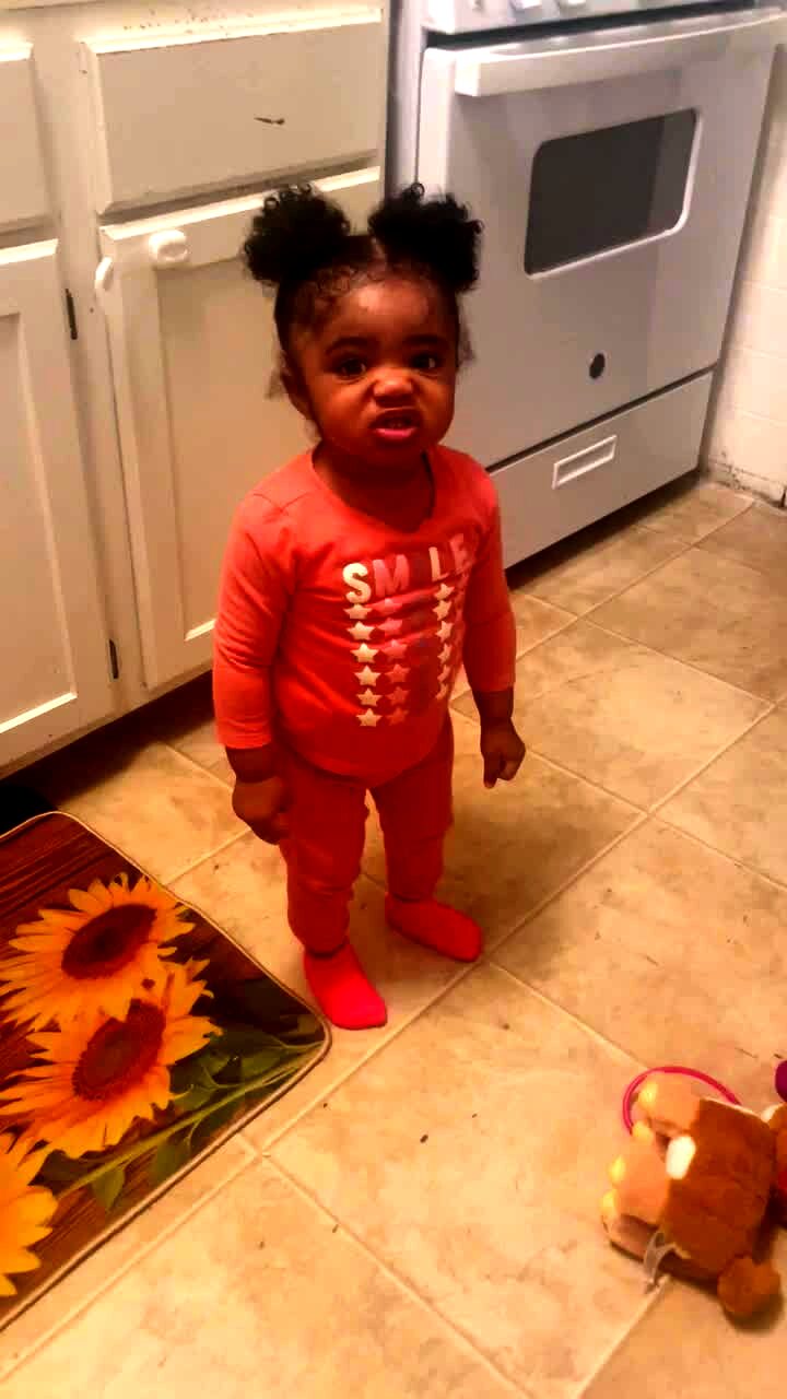 A mother asks her baby girl daughter to show off her new trick in a bedroom, and the baby girl burps loudly.