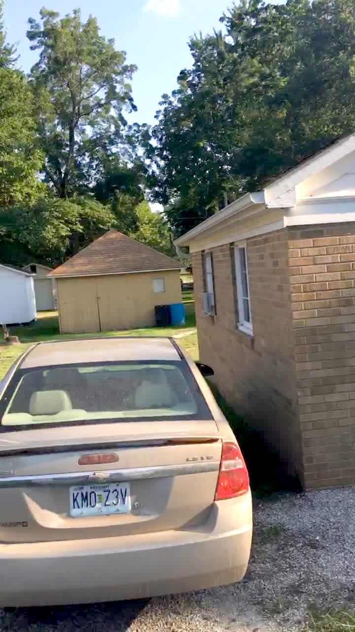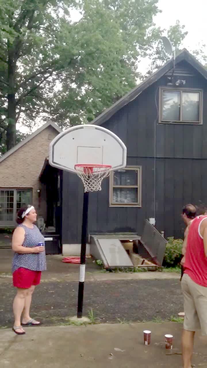 A man breaks a window with a basketball after the ball bounces off of the ground in to the window after he throws it at a basketball hoop while he stands far away in the front yard.
