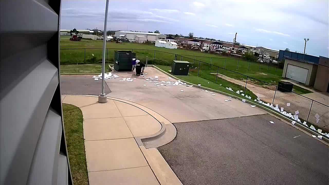 Two teen boys repeatedly try to throw recyclables into a dumpster but the wind blows everything onto the floor. Security camera footage.