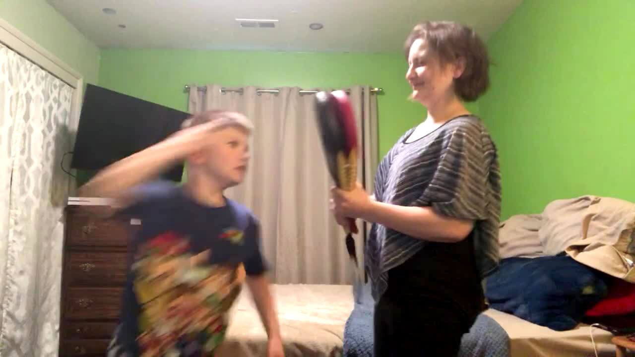 A young boy punches a punching glove while he mom holds it, and then he lets her try and when she hits it it hits him in the face.