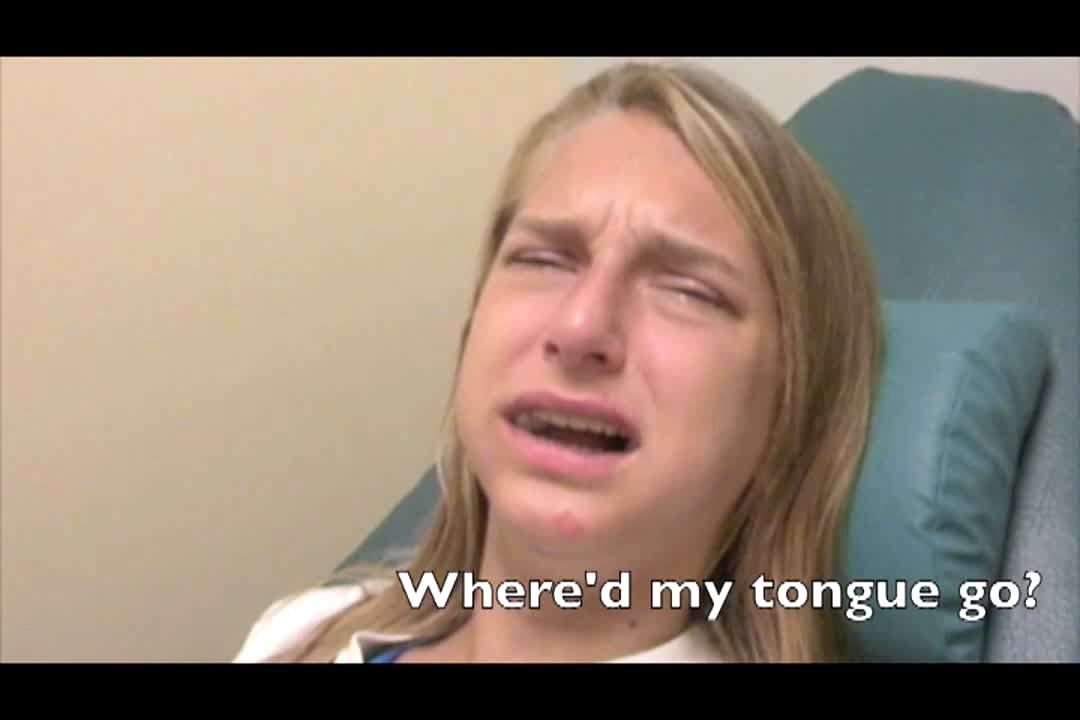 "Recovery Room Rambler" A teen girl cries, loopy from anesthesia in a dentist's office, saying "She's sorry, she loves everyone, and she thinks she lost her tongue. She also asked her mom if God's in her mouth when her mom says there's gauze in her mouth. Several cuts in clip. Subtitles for what she says.
