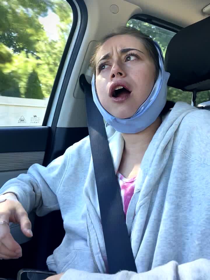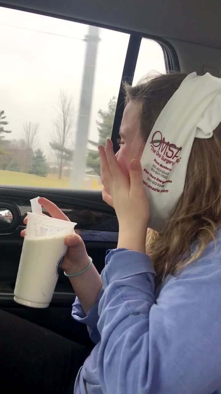 A teen girl rides in a car after wisdom teeth surgery and cries because there's holes in her mouth and she holds a milkshake and says to her mom "AND ALL I GET IS THIS?! MY TEETH GRINDED UP?!"