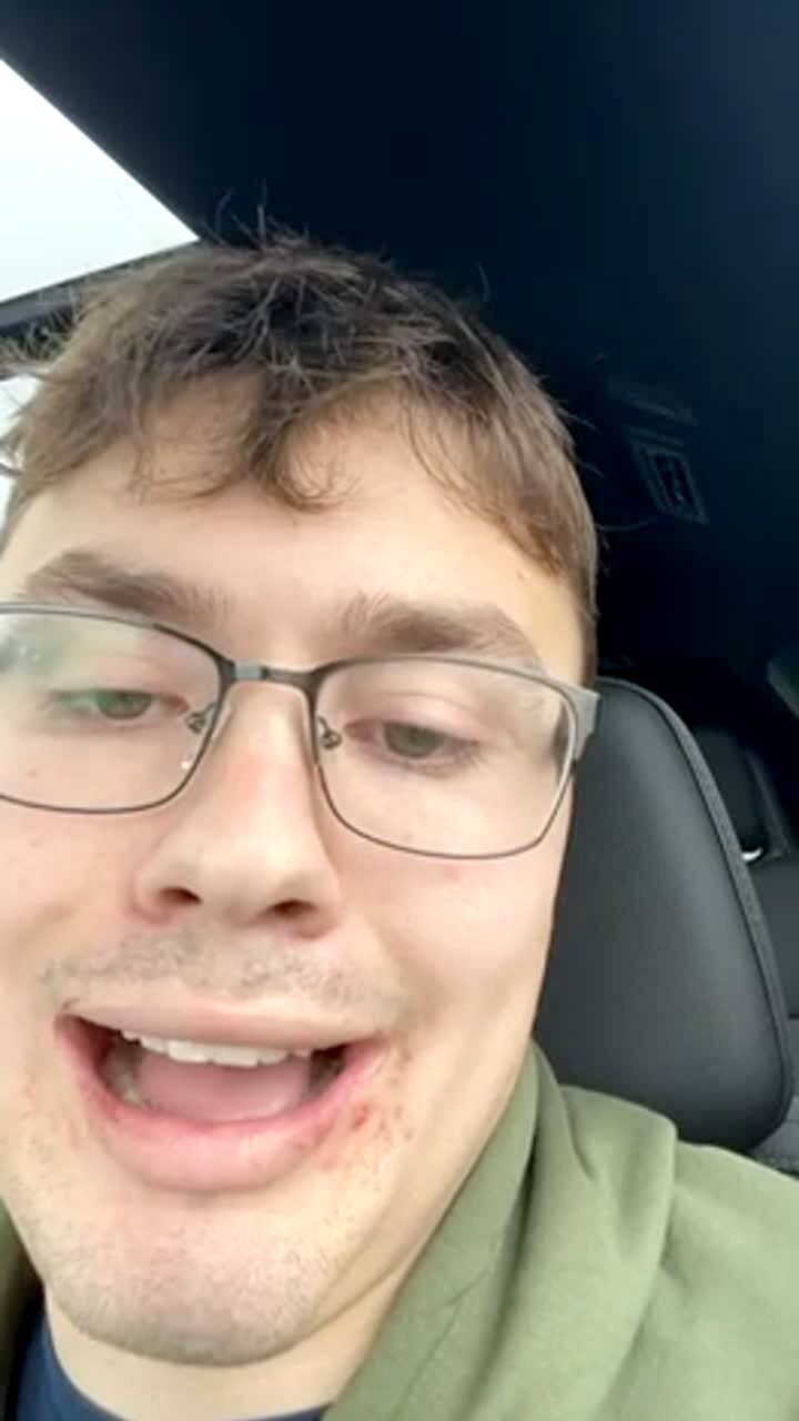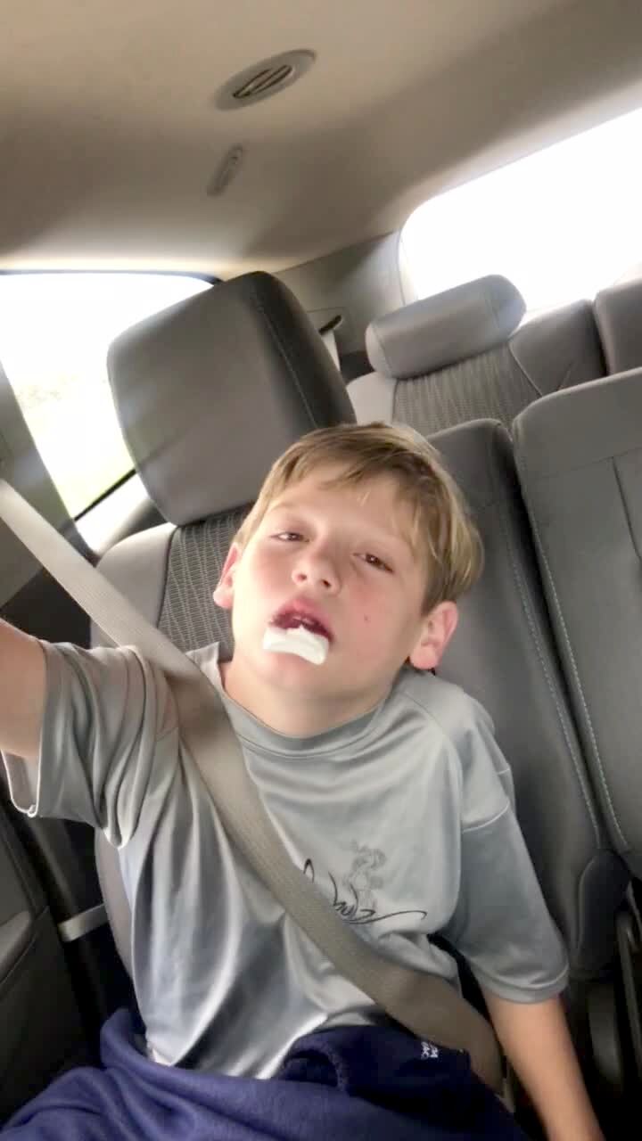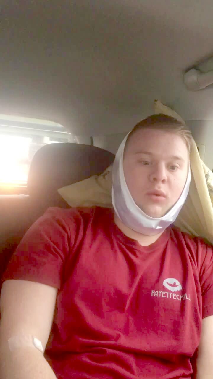 A teen boy in a car talks to the camera under anesthesia. He says he had to fight the gingerbread man when he woke up from surgery.