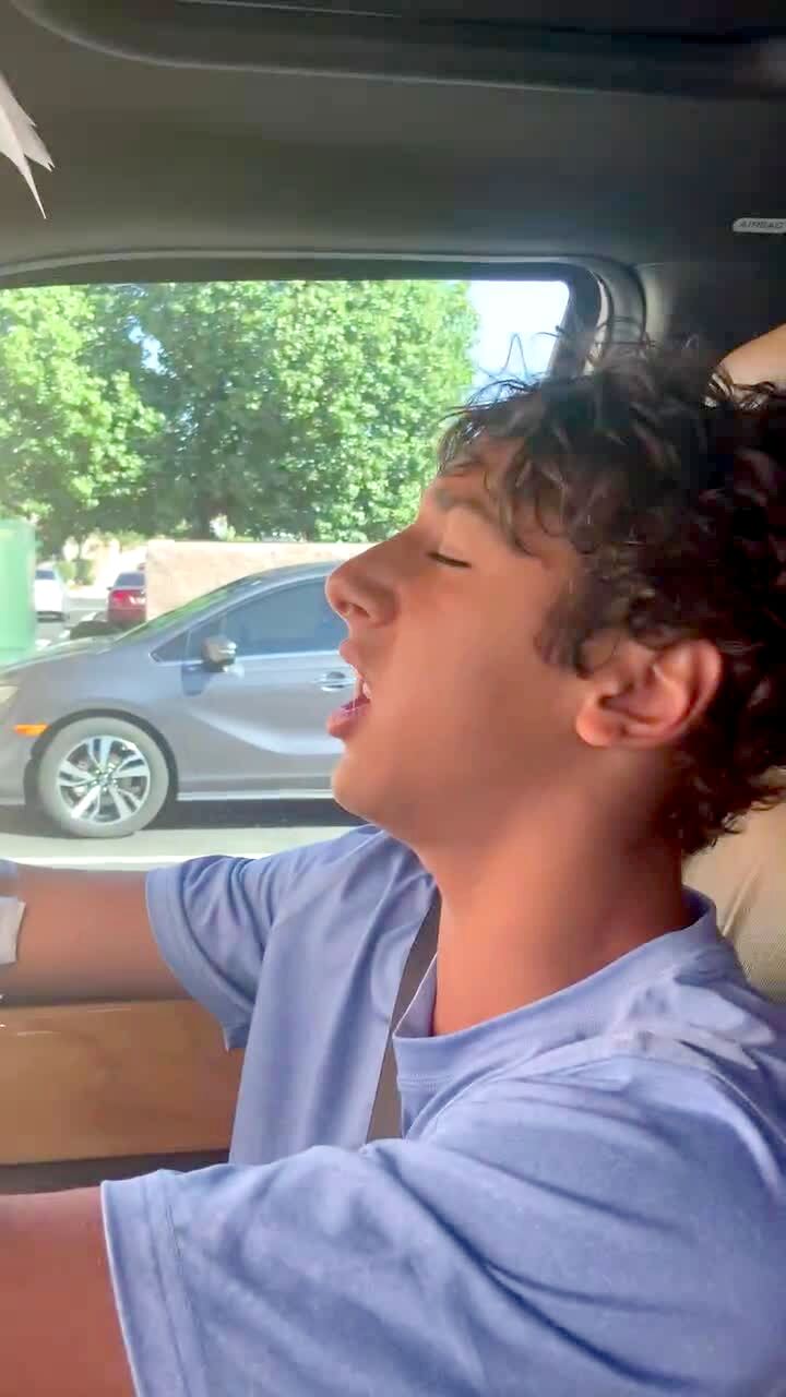 A teen boy holds his arms out in a parked car after wisdom tooth surgery and pretends to drive a car. He says that the car goes two hundred miles per hour while he makes engine noises.