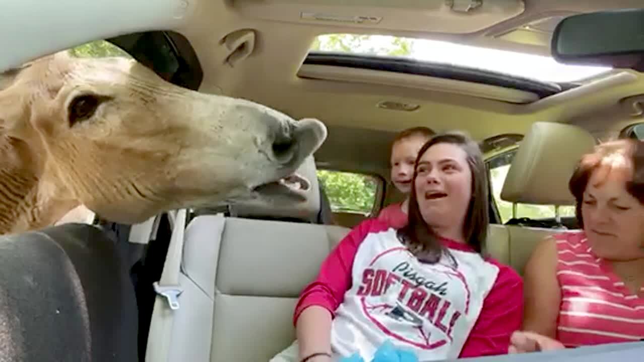 A donkey sticks its head through a car window and makes faces at a teen girl in a drive-thru safari.