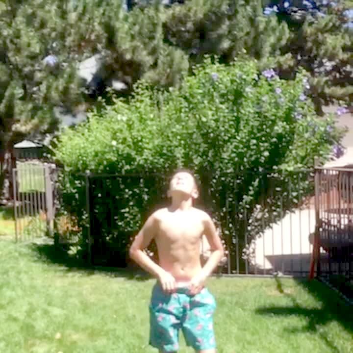A young boy throws a water balloon and catches it in his pants as the water balloon hits him in the groin. Slow Motion.