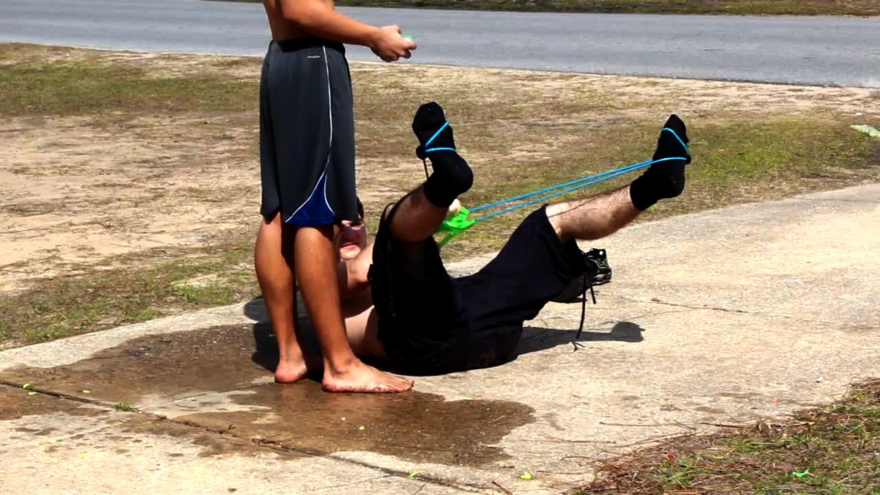 A teen boy rigs a sling shot to his feet and shoots a water balloon that gets caught in the sling shot, springs back, and hits the boy in the face.