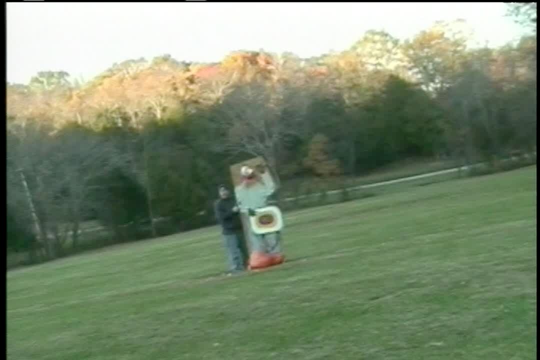 Boy shoots a small pumpkin out of a water balloon gun. The pumpkin shoots out backwards & hits boy in the stomach / groin. A little hard to see.