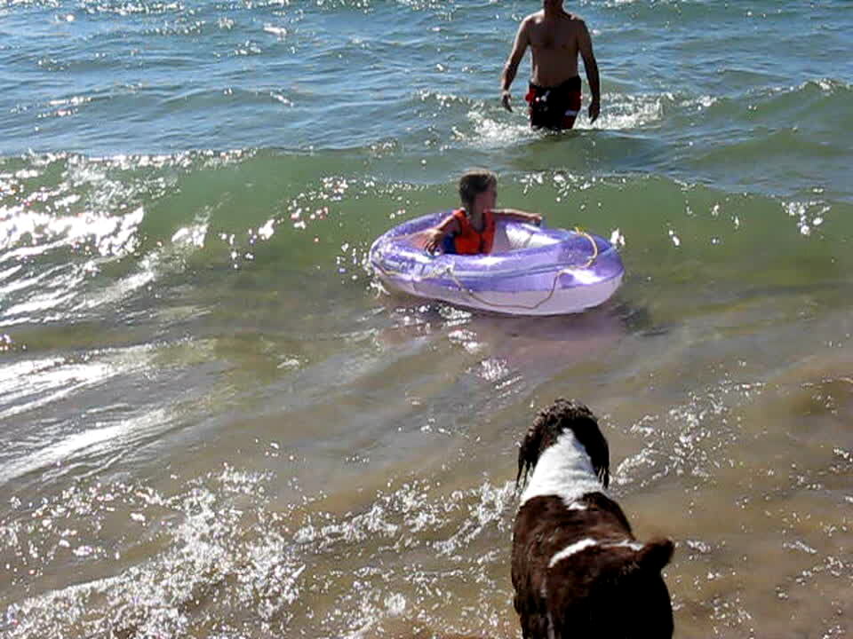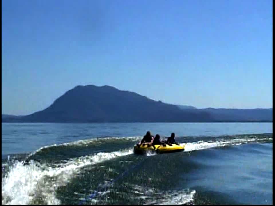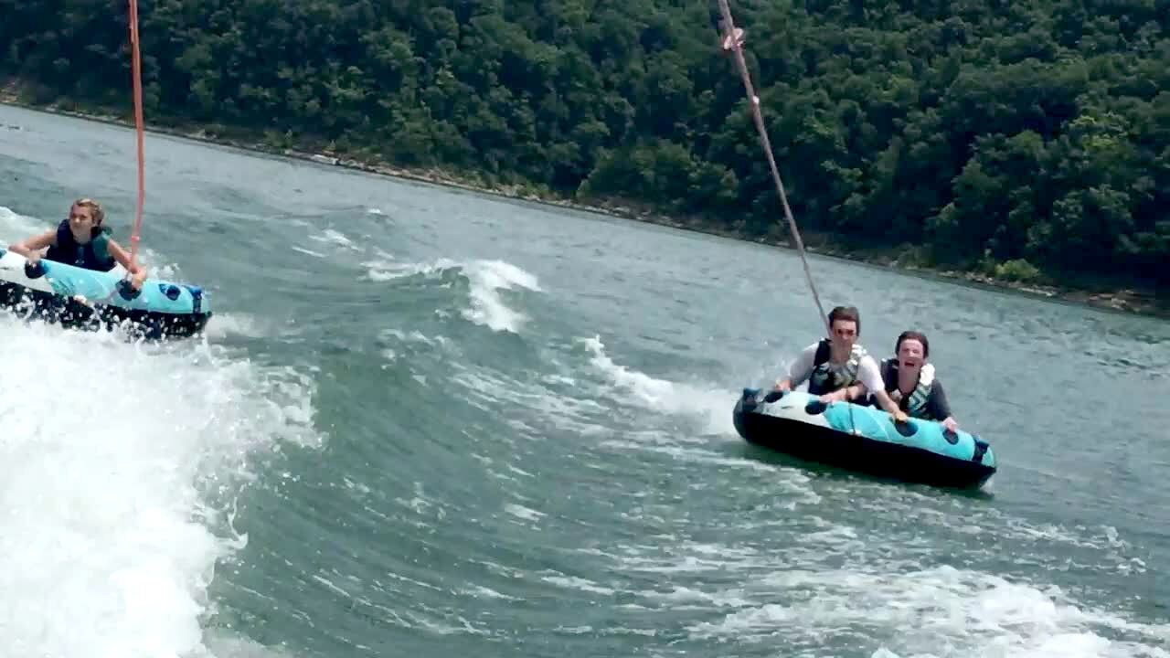 Family goes tubing together on the water, a big wave hits the inner tube & young boy is thrown about 15 feet into the air. (same clip as 656773)