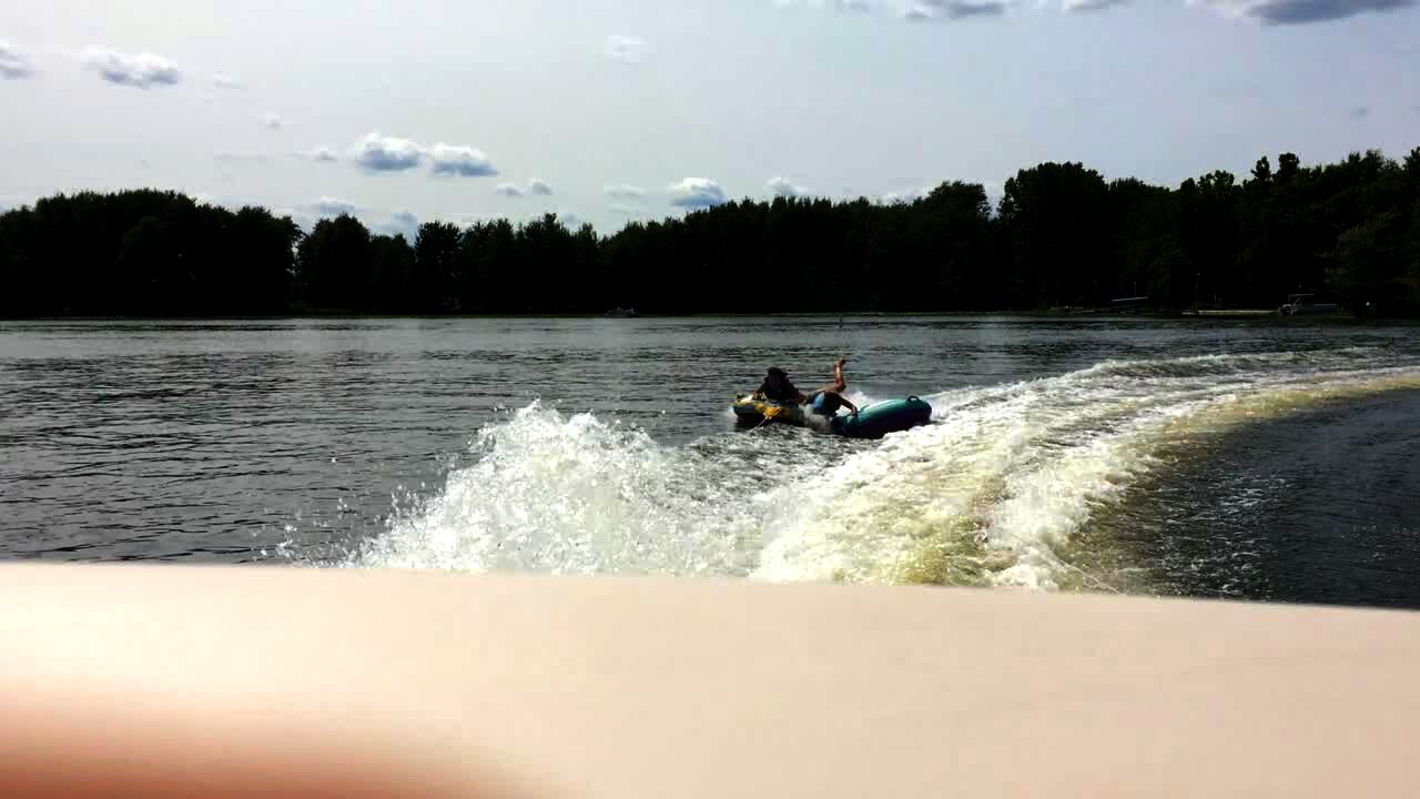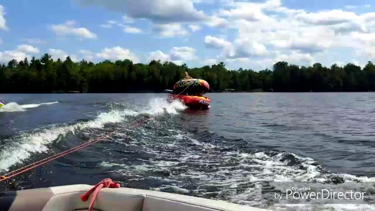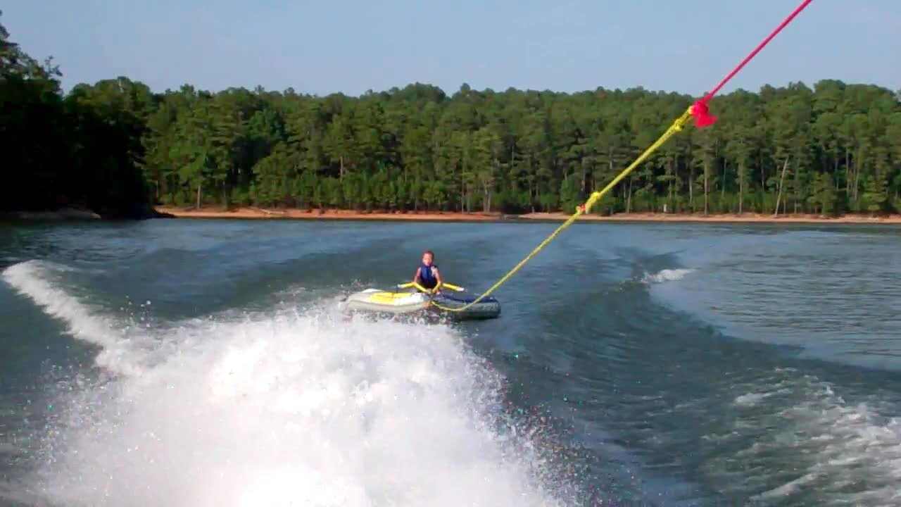 Boy rides innertube behind boat on lake, innertube gets picked up by wind and slams back into water, throwing boy off.