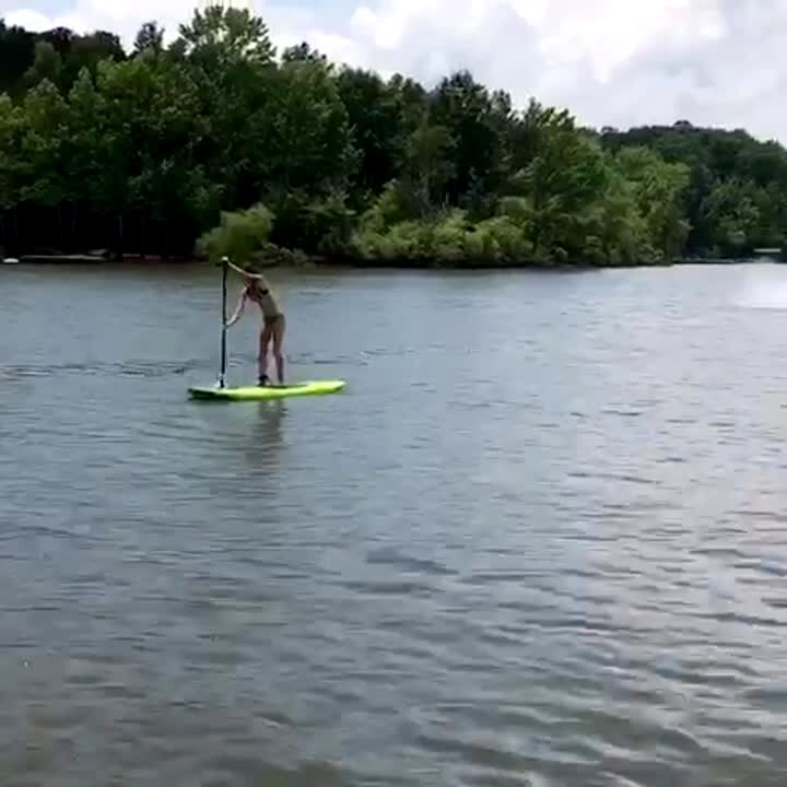 A teen girl rides a paddle board in a river and a teen boy rides past her on a jet ski and splashes water at her, so she loses balance and falls into the water.