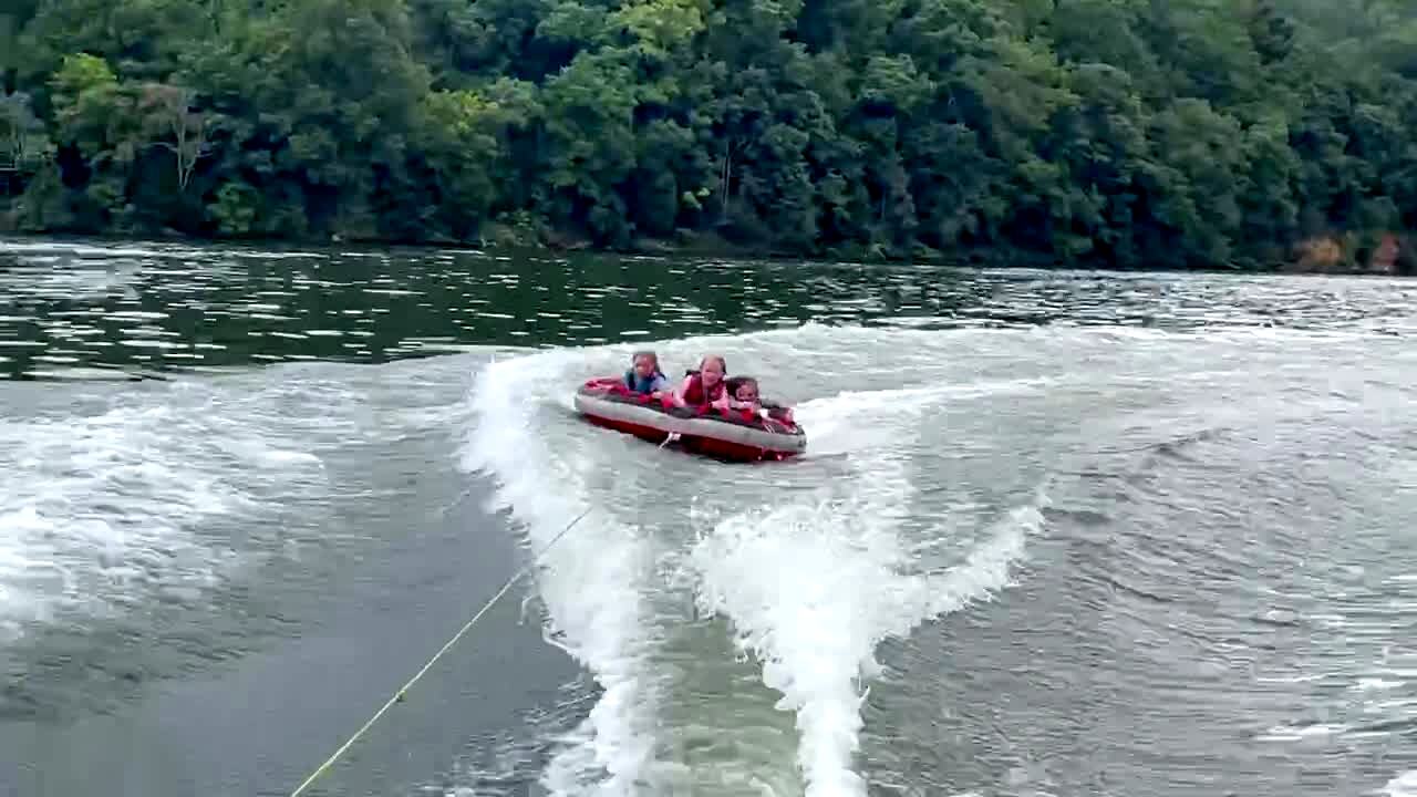 Three young girls ride on a raft tied to a boat on a lake, then they hit a bump and fly up in the air.