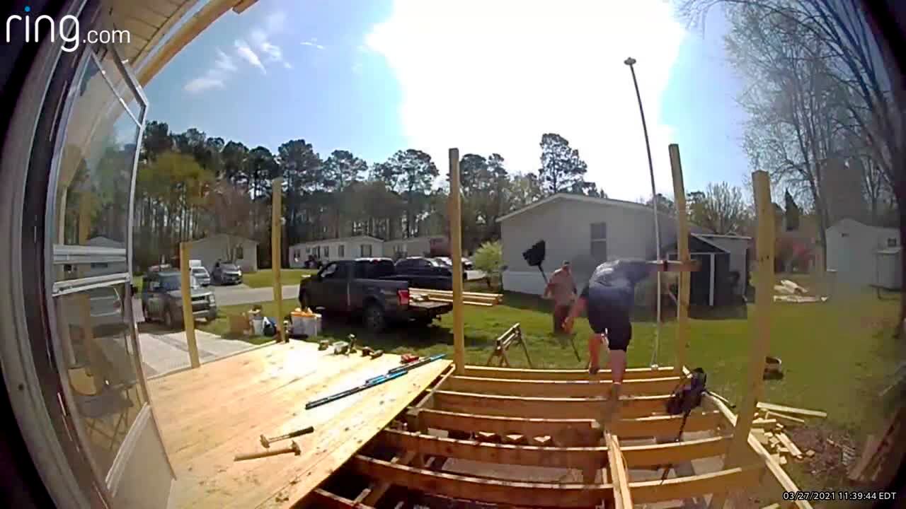 "Backyard Bumbler" A man tries to bring a fan onto a deck but trips and jumps off of the deck in a yard without falling. Security footage. Music rights not cleared.