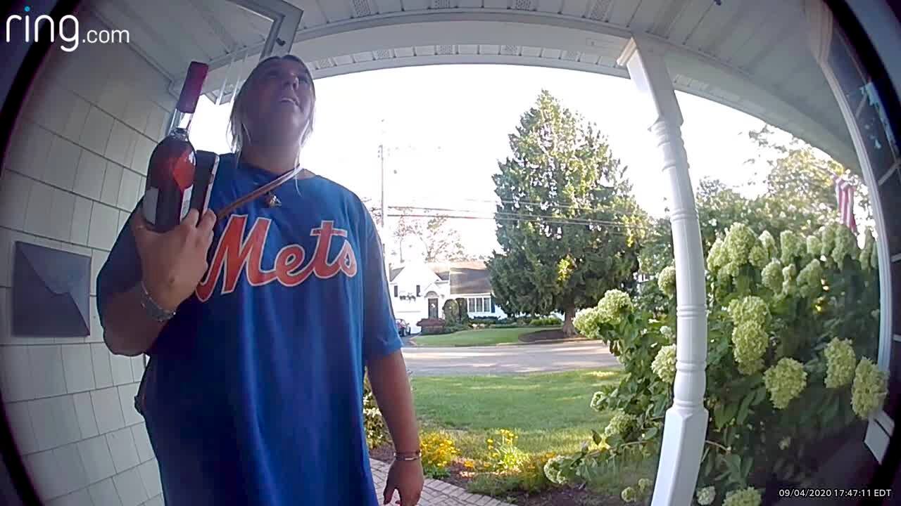 A man tries to move a toilet down the front porch steps, and the toilet falls on top of him as it spills rust water. Home security footage.