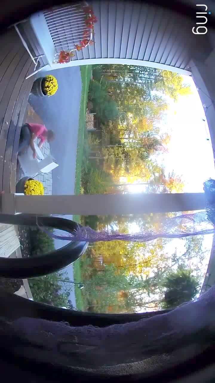 A woman falls onto her back when she walks up the porch steps, and says "I'm on the ground". Then she struggles to open the front door and talks about how the camera recorded her fall. Security footage.
