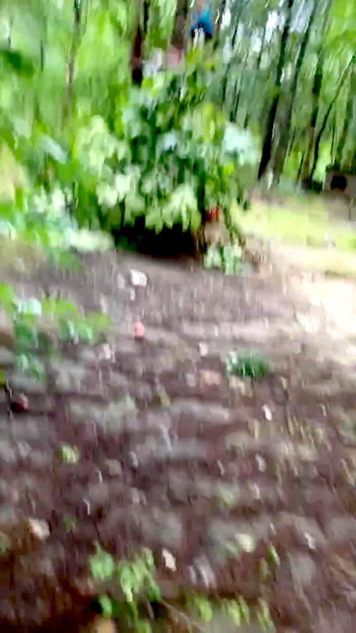 A woman falls down a short flight of outdoor stairs as she takes out the garbage. Security footage.