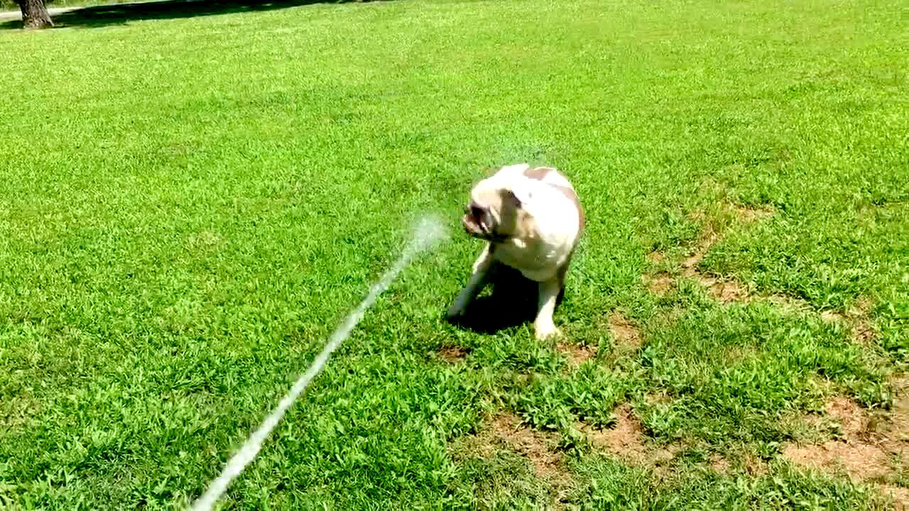 An English bulldog dog attacks water from a garden hose in a yard and repeatedly snaps his jaws at it.