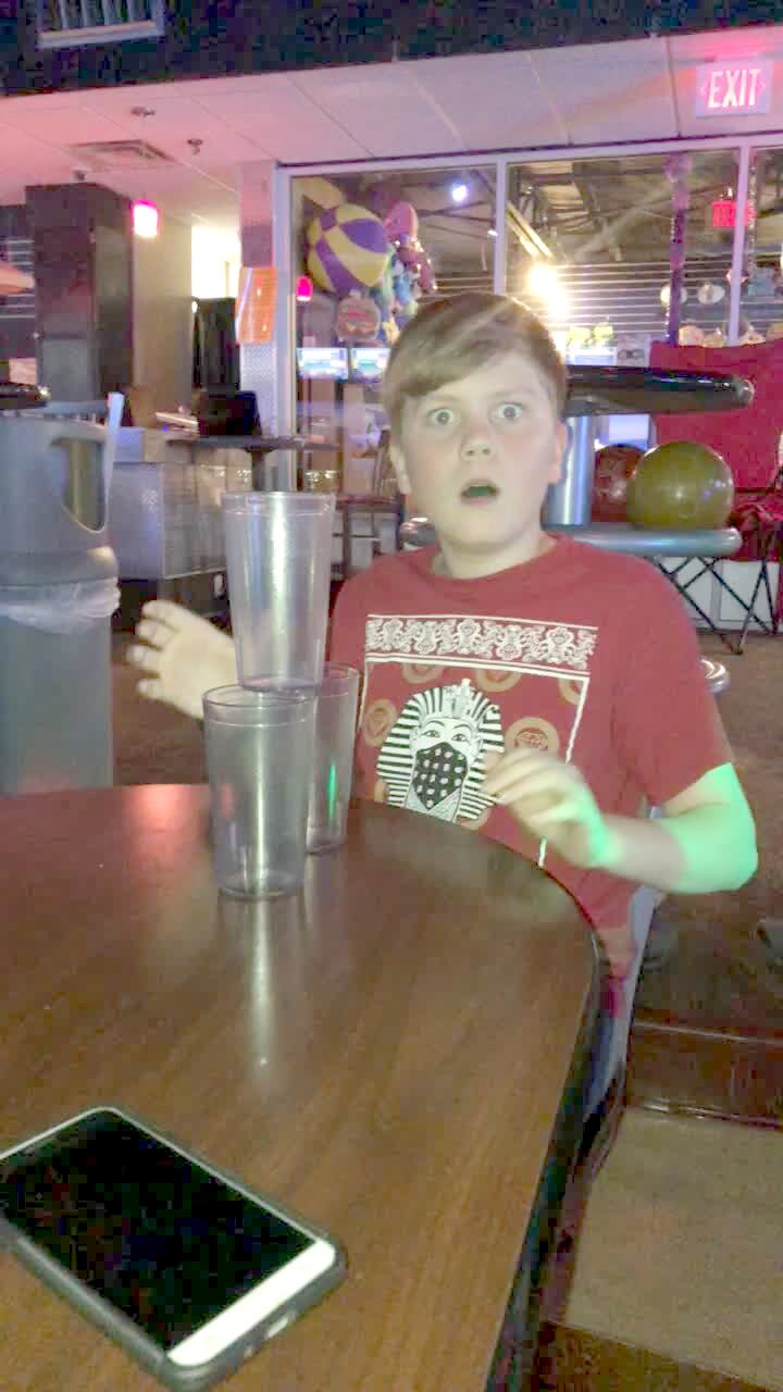 A young boy blows on plastic cups in a restaurant and pops one of them up on top of the others.