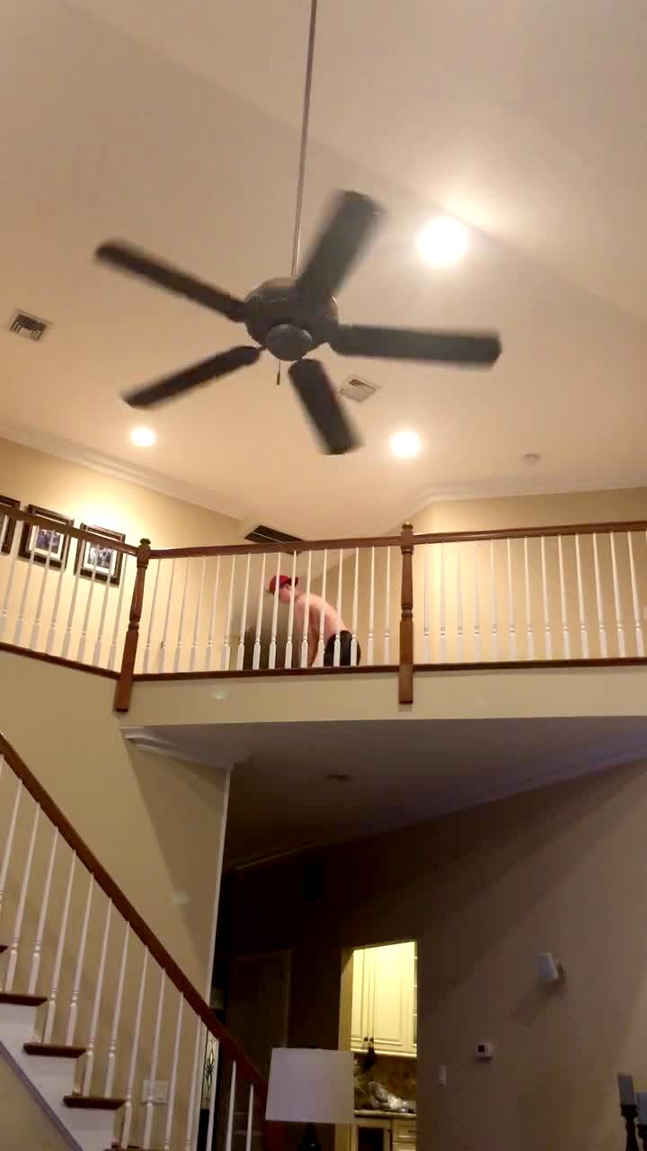 A teen boy on the upper floor of a house chips a ball with a golf club into a cup as the cup rotates on a ceiling fan and he shouts "Let's go!"