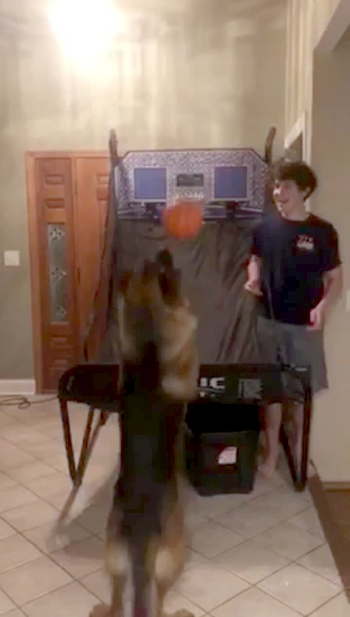 A German Shepherd dog smashes a ceiling light with a basketball as he jumps and hits the ball in the air with his nose as a teen boy throws the ball repeatedly and tries to make it into a toy hoop in a house.