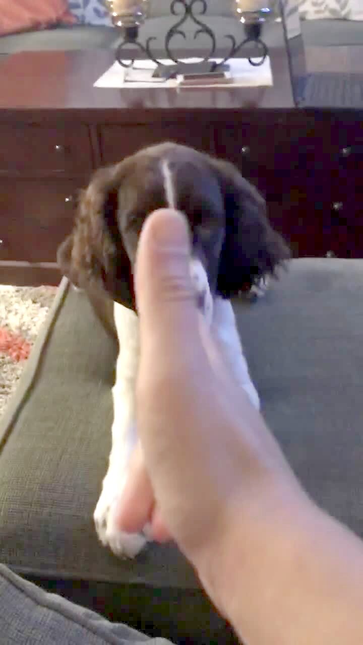 A woman with the camera pretends to shoot a dog with her finger and the dog rolls over on a living room cushion and slips and falls off.
