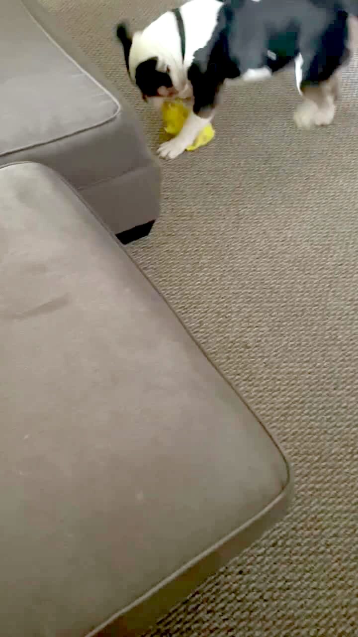 A dog walks into a room. A woman gasps. The dog looks up, alert. The woman gasps again and the dog runs away. Gasp at Your Dog Challenge