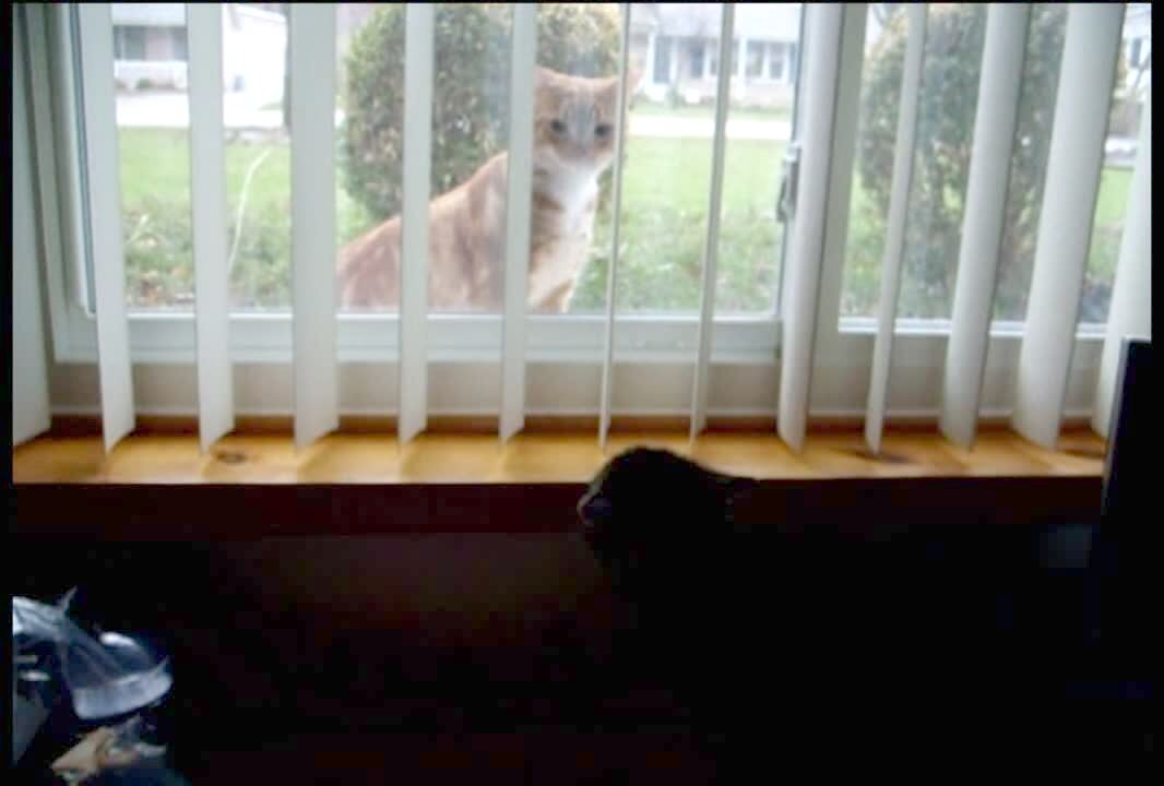 Cat outside window looks at growling cat inside. Third black cat leaps / jumps at the window and scares both cats