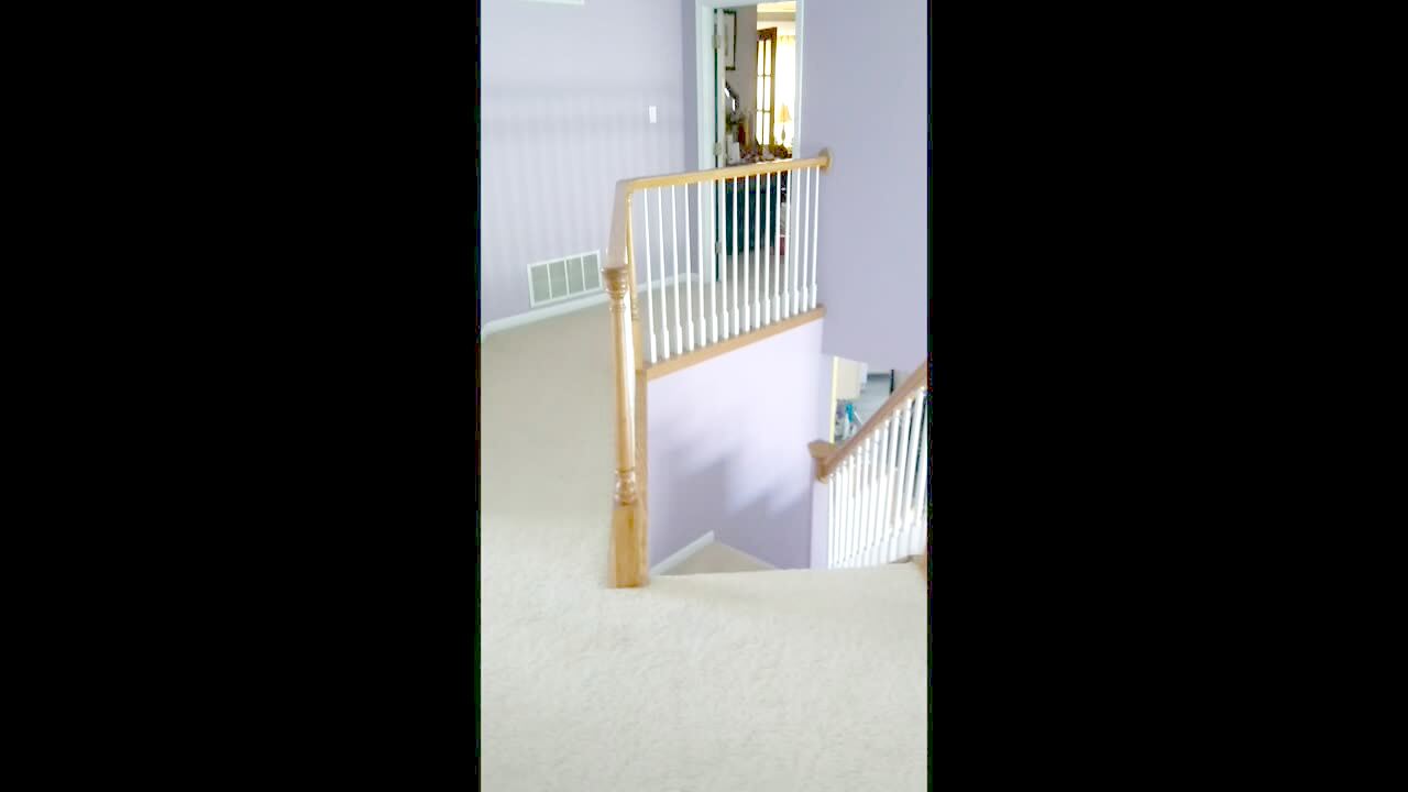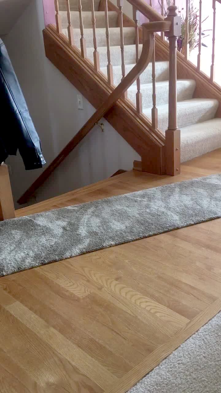 A dog walks towards the stairs and then a cat suddenly runs up the stairs and jumps up and attacks the dog.