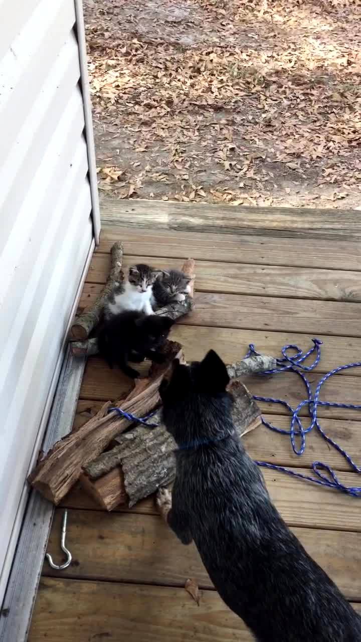A dog plays with three kitten cats on a porch. A cat comes from behind the house and chases the dog away.