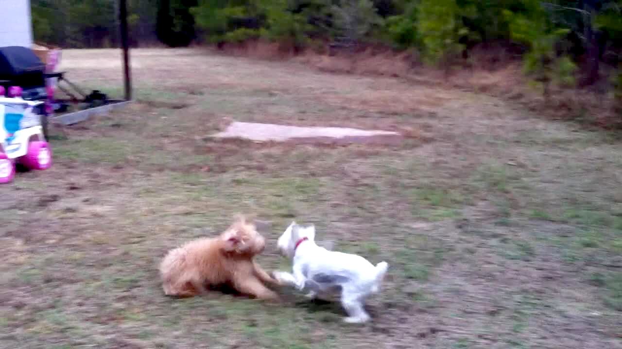 Two dogs growl while they play tug of war. A cat pounces on the brown dog and it runs away as it whines.
