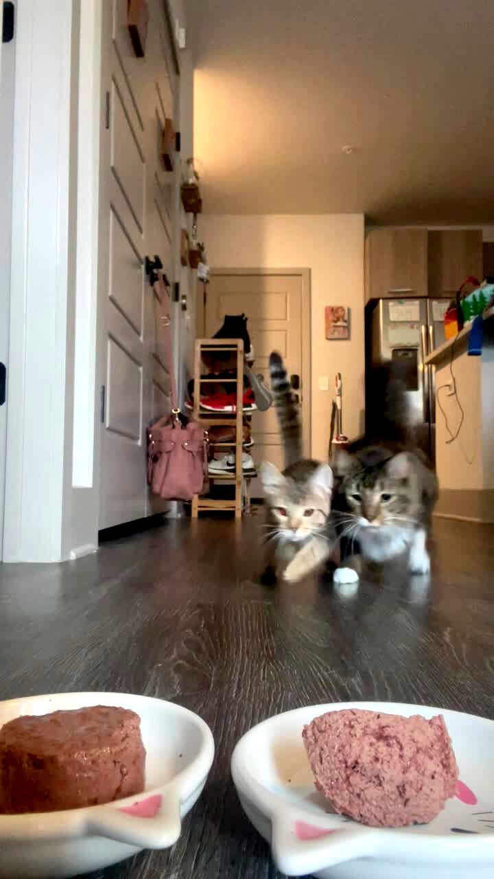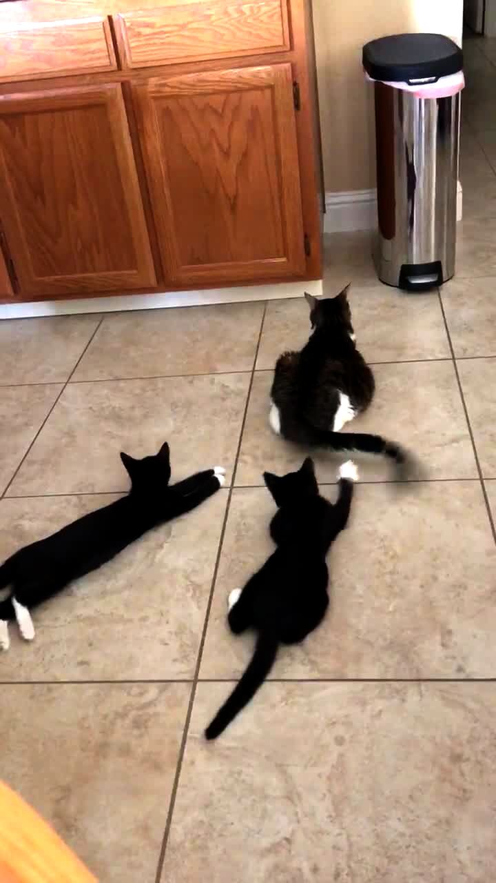 Two kitten lay on the kitchen floor behind another cat and they both swat at its tail while it wags it. Then at the end, the larger cat gets up and turns around and hits one of the kittens.