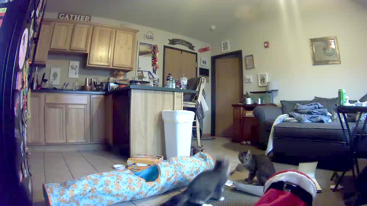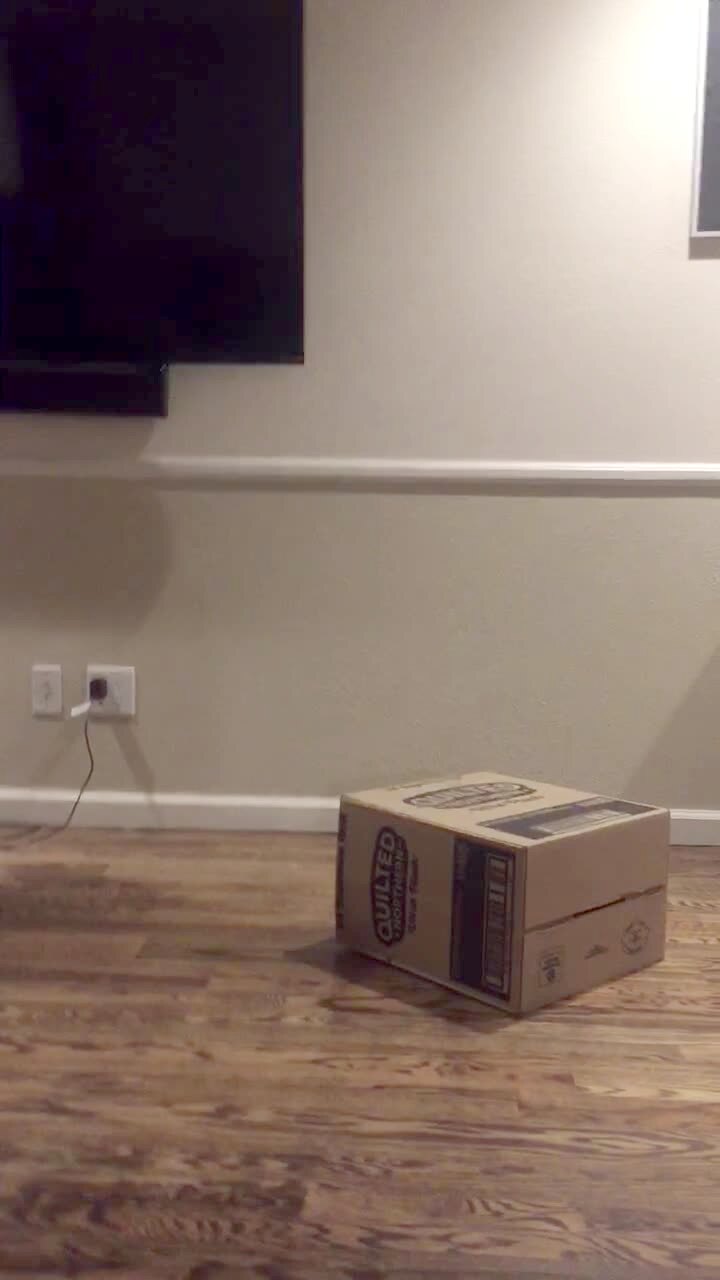 A cat hides in a box and jumps out and scares another cat when it walks into the room. Then they fight and play and roll around. Home security footage.