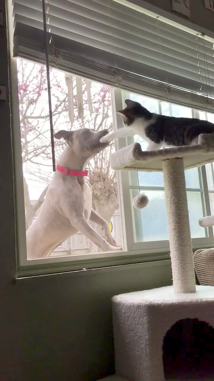 A dog jumps up and down to try to get a cat sitting at the top of cat tree. The dog is outside and the cat is on the other side of the window.