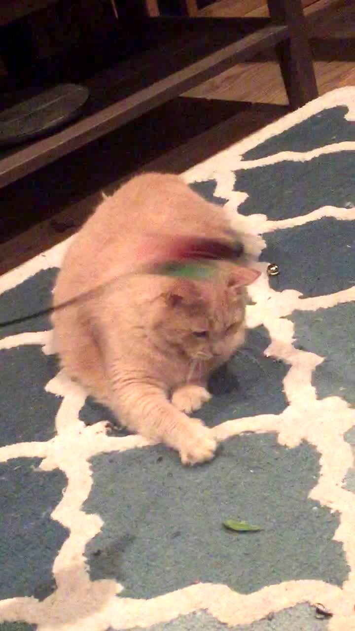 A cat lays on the living room floor and swats at a toy that its owner holds above it. Another cat off screen jumps and attacks the first cat and the first cat gets scared and runs away.