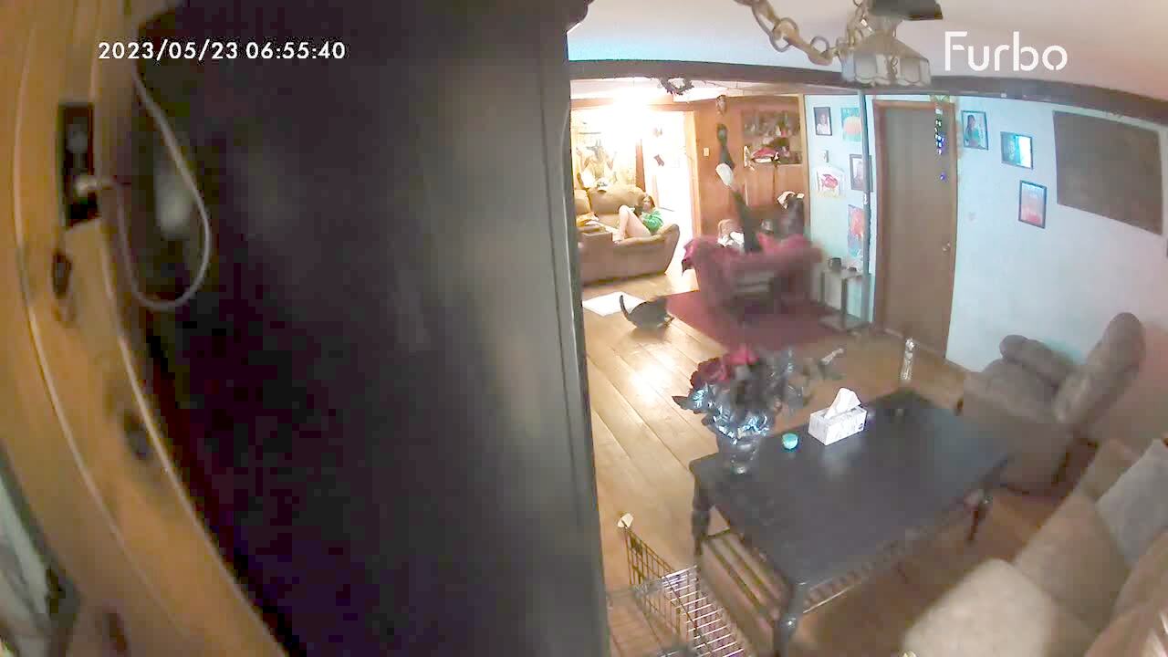 A woman sits in a chair in the living room and makes animal noises. Her cat jumps up at her, and the woman screams and knocks the recliner backwards and onto the ground. Security footage.