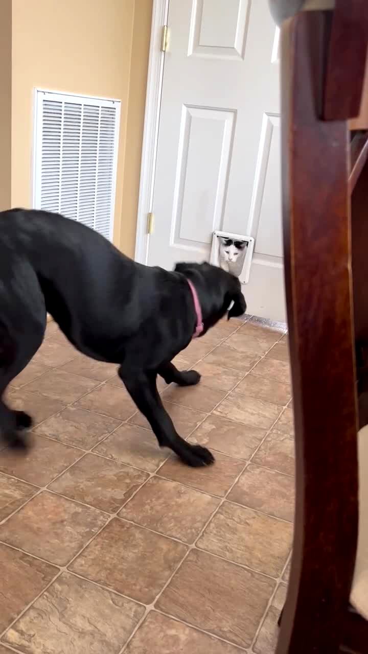 A cat looks through a cat door and watches a black Labrador Retriever sniff around. Then the dog notices the cat and jumps back.